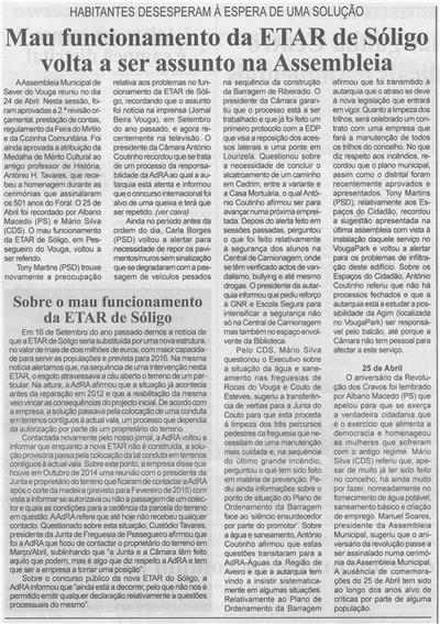 Mau funcionamento da ETAR de Sóligo volta a ser assunto na Assembleia : habitantes desesperam à espera de uma solução / Beira Vouga