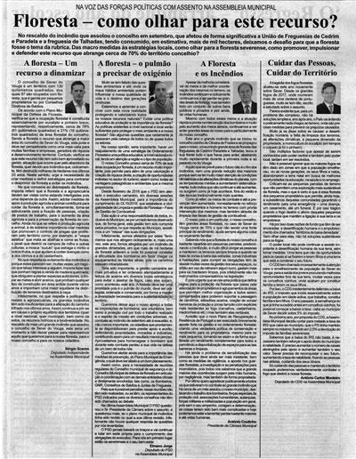 Floresta : como olhar para este recurso : na voz das forças políticas com assento na Assembleia Municipal / [ed. com.] Jornal Beira Vouga. A floresta : um recurso a dinamizar / Sérgio Soares; A floresta : o pulmão a precisar de oxigénio / Elmano Jorge; A floresta e os incêndios / António Coutinho; Cuidar das pessoas, cuidar do território / António Carlos Monteiro