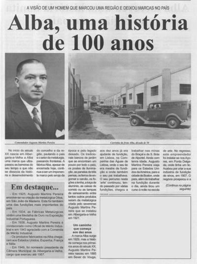 Alba : a visão de um homem que marcou uma região e deixou marcas no país : Alba escreveu uma história bonita na região e no país : Alba, garantia de bom fabrico ; A família Martins Pereira e o jornal Beira Vouga : Comendador chegou a ser proprietário da publicação ; História do jornal Beira Vouga ; Banco n.º 1 da Alba tem quase 90 anos : banco decora praças e jardins por todo o país ; Comemorações do Centenário da Alba ; Comendador Augusto Martins Pereira : um legado social, cultural e desportivo : marcas incontornáveis nas comunidades de Albergaria e Sever ; Sever e Albergaria homenageiam o benemérito ; Alba, uma escola de profissionais ; Da Alba saiu um carro totalmente português : criado por António Augusto Martins Pereira, neto do Comendador ; Alba, uma marca portuguesa no mundo : livro de Delfim Bismarck Ferreira e Pedro Manuel de Oliveira Martins Pereira ; Alba, uma marca portuguesa de automóveis : livro de José Rodrigues Barros