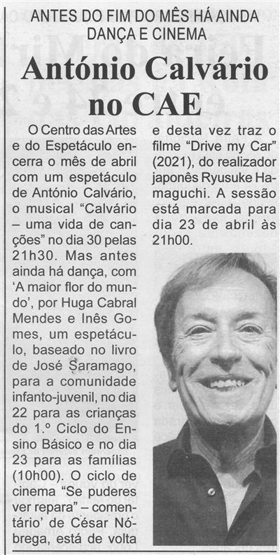 António Calvário no CAE : antes do fim do mês há ainda dança e cinema / Beira Vouga