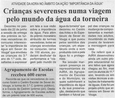 A importância da Água em Sever do Vouga ; A viagem pelo Mundo da Água da Torneira ; Agrupamento de Escolas recebeu 600 euros
