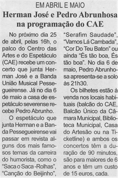 Herman José e Pedro Abrunhosa na programação do CAE : em abril e maio / Beira Vouga