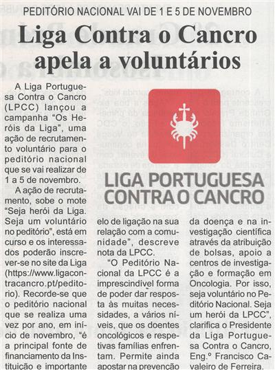 Liga Contra o Cancro apela a voluntários : peditório nacional vai de 1 a 5 de novembro / Beira Vouga