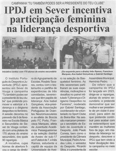 IPDJ em Sever incentiva participação feminina na liderança desportiva : campanha "Tu também podes ser a presidente do teu clube" / Beira Vouga