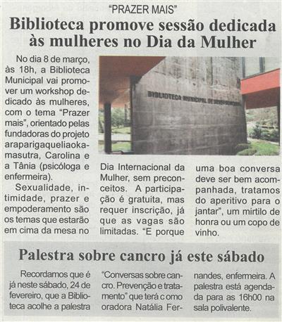 Biblioteca promove sessão dedicada às mulheres no Dia da Mulher : "Prazer Mais" / Beira Vouga