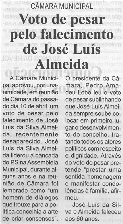 Voto de pesar pelo falecimento de José Luís Almeida : Câmara Municipal / Beira Vouga
