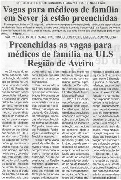 Preenchidas as vagas para médicos de família na ULS Região de Aveiro : são 21 postos de trabalhos, cinco dos quais em Sever do Vouga / Beira Vouga