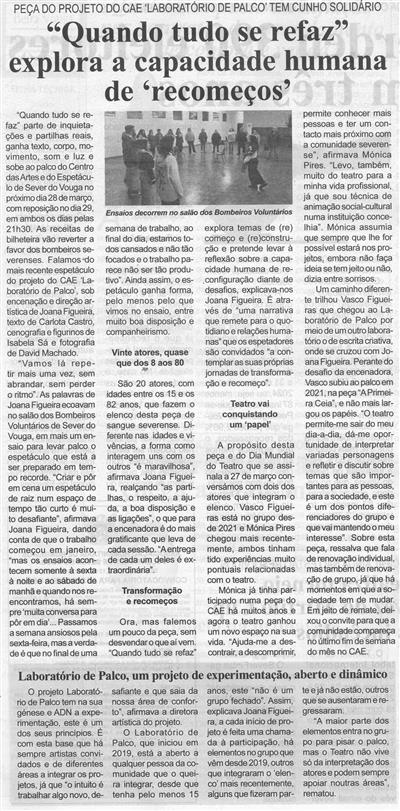 "Quando tudo se refaz" explora a capacidade humana de 'recomeços' : peça do projeto do CAE 'Laboratório de Palco' tem cunho solidário / Beira Vouga