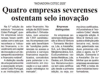 Quatro empresas severenses ostentam selo inovação : "Inovadora Cotec 2025" / Beira vouga