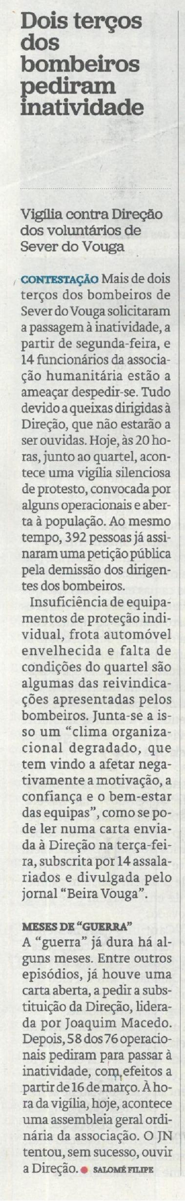Dois terços dos bombeiros pediram inatividade : vigília contra Direção dos voluntários de Sever / Jornal de Notícias