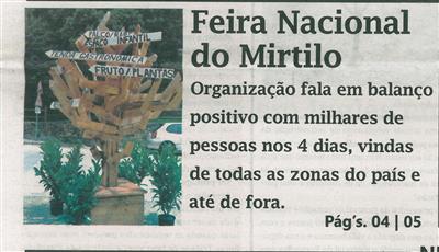 Feira do Mirtilo ; Feira Nacional do Mirtilo ; Organização fala em balanço positivo com milhares de pessoas nos 4 dias, vindas de todas as zonas do país e até de fora ; Capital do Mirtilo ; Primeiro balanço é positivo ; Mais gente na 5.ª feira e no domingo à noite ; Desfile de moda ; Showcooking ; Secretário de Estado visita a Feira ; Visita ao Campo Experimental ; Passeio de Renault 4L ; Rota do Mirtilo em vespa