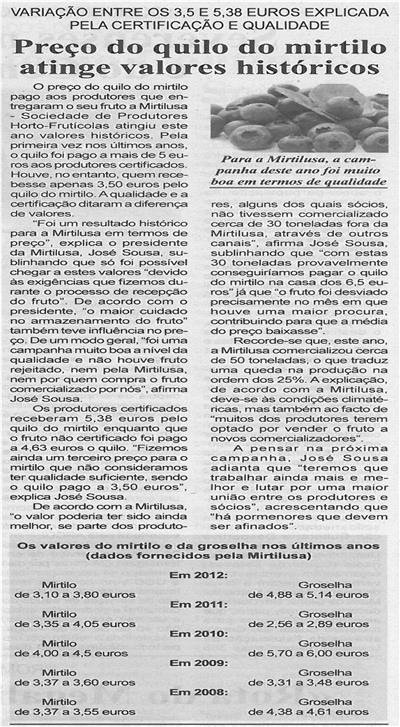 Preço do quilo do mirtilo atinge valores históricos : variação entre os 3,5 e 5,38 euros explicada pela certificação e qualidade / Beira Vouga