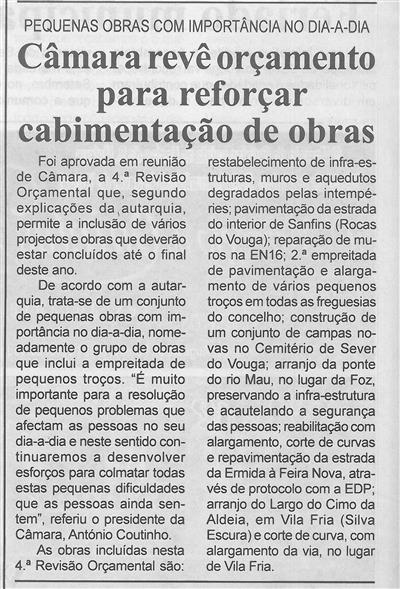 Câmara revê orçamento para reforçar cabimentação de obras : pequenas obras com importância no dia-a-dia / Beira Vouga