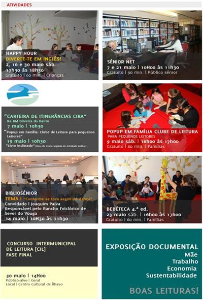 Atividades : [maio 2015] : Happy Hour : Sénior Net : Carteira de Itinerâncias CIRA na BM Oliveira do Bairro : Popup em Família Clube de Leitura : Bibliosénior : Bebéteca : Concurso Intermunicipal de Leitura CIL fase final : Exposição Documental : mãe : trabalho : economia : sustentabilidade / BMSV