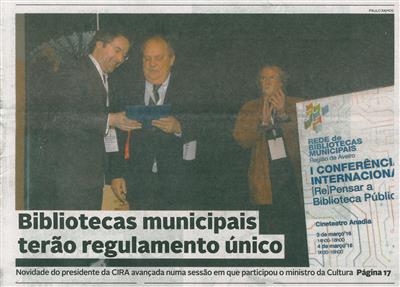 Bibliotecas municipais terão regulamento único : novidade do Presidente da CIRA avançada numa sessão em que participou o Ministro da Cultura / António Jorge Pires