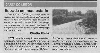 Carta do leitor : Estrada em mau estado / Manuel A. Tavares