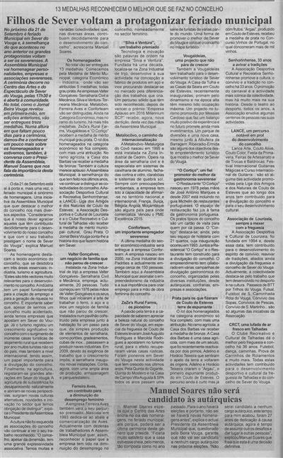 13 medalhas reconhecem o melhor que se faz no concelho ; Os homenageados ; Valter Gonçalves : um negócio de família que não parou de crescer ; Ferreira Aves : um contributo para a diminuição do desemprego feminino ; Silva e Ventura : um trabalho premiado ; Metalcôvo : o caminho da internacionalização ; Conforteam : um importante empregador severense ; Zeze's Rural Farms : os pioneiros ; Vougaldeias : um projeto que não para de crescer ; O cortiço : um fiel promotor do melhor da gastronomia severense ; Prata para os que fizeram de Couto de Esteves terra de espumante ; Senhorinhense : 33 anos a avivar as tradições ; LANCE : um percurso notável em prol do desenvolvimento do concelho ; Associação de Lourizela : sempre a mexer com a freguesia ; CRCT : uma lufada de ar fresco em Talhadas ; Manuel Soares não será candidato às autárquicas ; Medalha de Mérito Municipal Categoria Cultural ; Medalha de Mérito Municipal Categoria Económico Ramo Indústria ; Medalha de Mérito Municipal Categoria Económico Ramo Turismo ; Medalha de Mérito Municipal Categoria Económico Ramo Agrícola