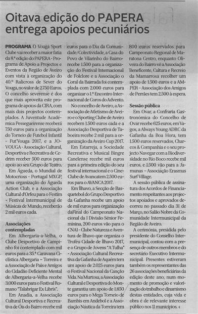 PAPERA : Programa de Apoio a Projetos e Eventos da Região de Aveiro ; 40.º Ralicross de Sever do Vouga ; Torneio de Futebol Infantil Fut Vouga 2017 ; Mundial de Motocross : Portugal MXGP ; FESTIM Festival Intermunicipal de Músicas do Mundo ; 35.ª Caravana Ciclística Albergaria Torreira ; Talabrigar Ex Libris : festival romano : Albergaria-a-Velha ; Festival Internacional de Folclore de Vilarinho do Bairro ; 1.º Encontro Internacional de Coros do Advento ; Aveiro Cup 2017 : Associação Desportiva da Taboeira ; Troféu Cidade de Ílhavo 2017 ; Navegar com a biodiversidade no Rio Boco ; Jamunas : Associação Erasmus Surf Village ; Festival Nacional da Canção Vida ; Mega Torneio de Bambis em Andebol ; Campeonato Regional de Maratona Centro