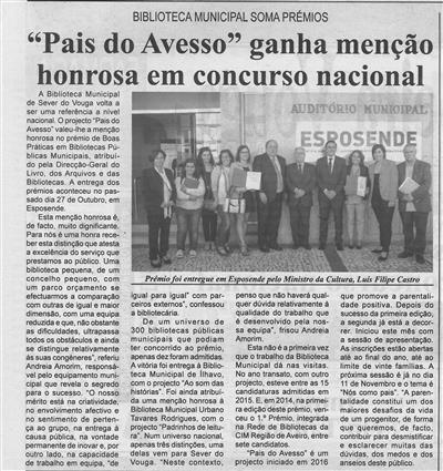 Pais do Avesso : Galardão foi entregue no Encontro da Rede Nacional de Bibliotecas Públicas em Esposende ; Pais do Avesso : promover o conceito de parentalidade positiva junto das famílias ; Ao som das histórias : projeto da Biblioteca Municipal de Ílhavo recebe Prémio de Boas Práticas em Bibliotecas Públicas Municipais ; Parentalidade positiva