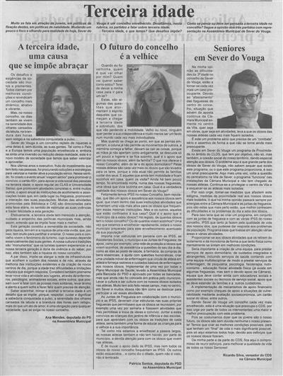 Terceira idade / [ed. com.] Beira Vouga. A terceira idade, uma causa que se impõe abraçar / [autor associado] Ana Mendes; O futuro do Concelho é a velhice / [autor associado] Patrícia Santos; Seniores em Sever do Vouga / [autor associado] Ricardo Silva