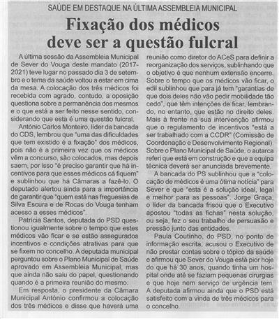 Saúde em destaque na última Assembleia Municipal : fixação dos médicos dever ser a questão fulcral / Beira Vouga