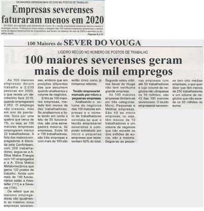 Empresas severenses faturaram menos em 2020 : 100 maiores geraram mais de dois mil postos de trabalho ; Tecido empresarial marcado por micro e pequenas empresas