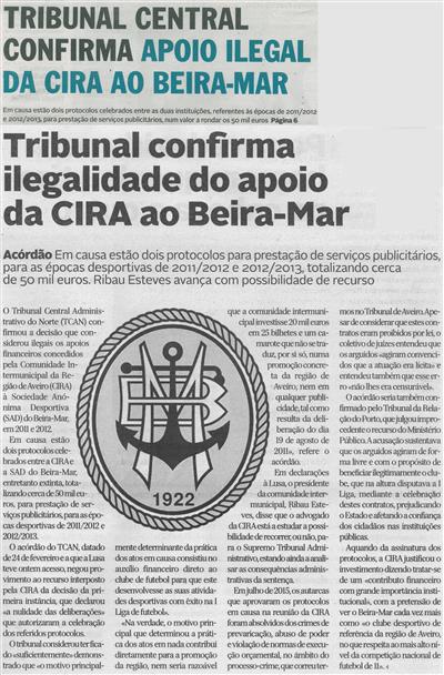 Tribunal Central confirma apoio ilegal da CIRA ao Beira-Mar ; Em causa estão dois protocolos para prestação de serviços publicitários, para as épocas desportivas de 2011-2012 e 2012-2013, totalizando cerca de 50 mil euros ; Ribau Esteves avança com possibilidade de recurso