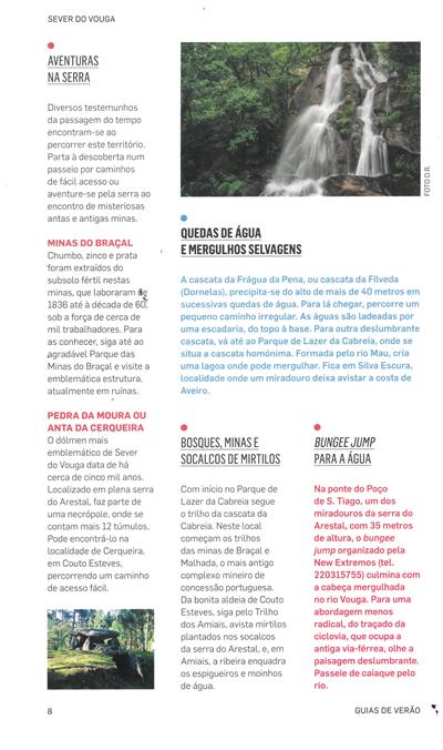Guia de verão ; Descubra um país que poucos conhecem ; Boa cama boa mesa ; Aventuras na Serra ; Minas do Braçal ; Pedra da Moura ou Anta da Cerqueira ; Quedas de água e mergulhos selvagens ; Bosques, minas e socalcos de mirtilos ; Bungee Jump para a água ; Comer na Terra e dormir junto à água ; Do Vouga ao Dão por estações e apeadeiros ; Praia Fluvial Quinta do Barco