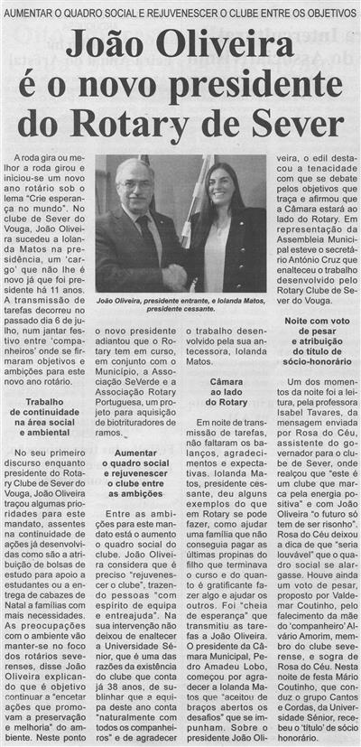 João Oliveira é o novo presidente do Rotary de Sever : aumentar o quadro social e rejuvenescer o clube entre os objetivos / Beira Vouga
