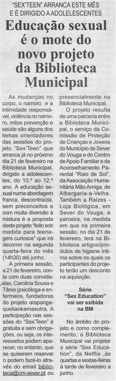 Educação sexual é o mote do novo projeto da Biblioteca Municipal : "Sex'Teen" arranca este mês e é dirigido a adolescentes / Beira Vouga