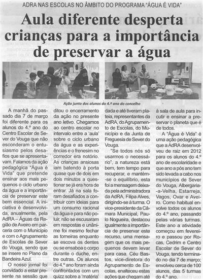 Aula diferente desperta crianças para a importância de preservar a água : AdRA nas escolas no âmbito do programa "Água é Vida" / Beira Vouga