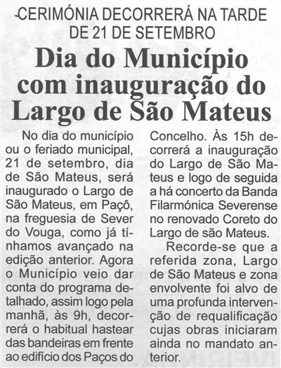 Dia do Município com inauguração do Largo de São Mateus : cerimónia decorrerá na tarde de 21 de setembro / Beira Vouga