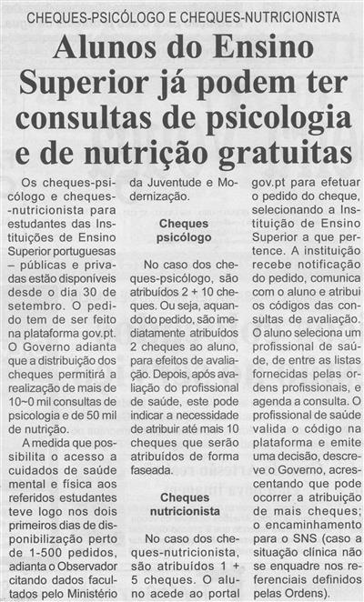 Alunos do Ensino Superior já podem ter consultas de psicologia e de nutrição gratuitas : cheques-psicólogo e cheques-nutricionista / Beira Vouga