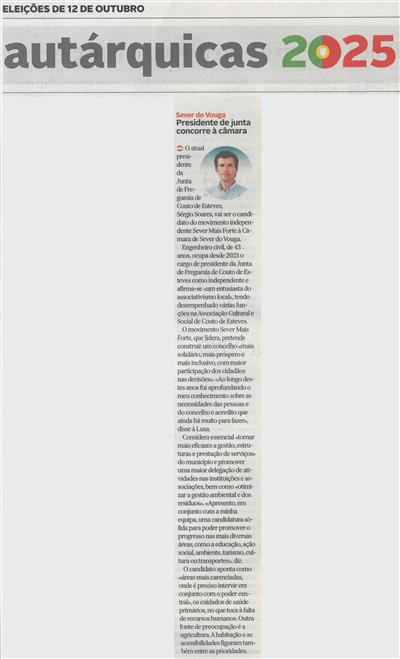 Presidente de junta concorre à câmara : Sever do Vouga : Autárquicas 2025 : eleições de 12 de outubro / Diário de Aveiro