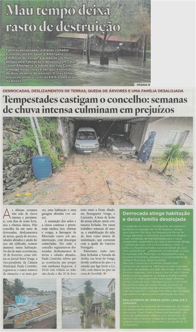 Tempestades castigam o concelho : semanas de chuva intensa culminam em prejuízos : derrocadas, deslizamentos de terras, queda de árvores e uma família desalojada / Beira Vouga