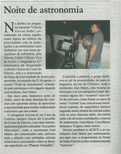 Noite de astronomia ; ACSCE revela os segredos do universo em noite de astronomia ; ACSCE proporcionou uma noite verdadeiramente espacial ; Programa nacional Ciência Viva no Verão ; Excursões marcianas ; Estrela polar e constelações Andrómeda, Ursa Maior, Ursa Menor, Balança e Virgem