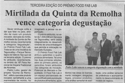 Mirtilada da Quinta da Remolha vence categoria degustação : terceira edição do prémio Food Fab Lab / Beira Vouga