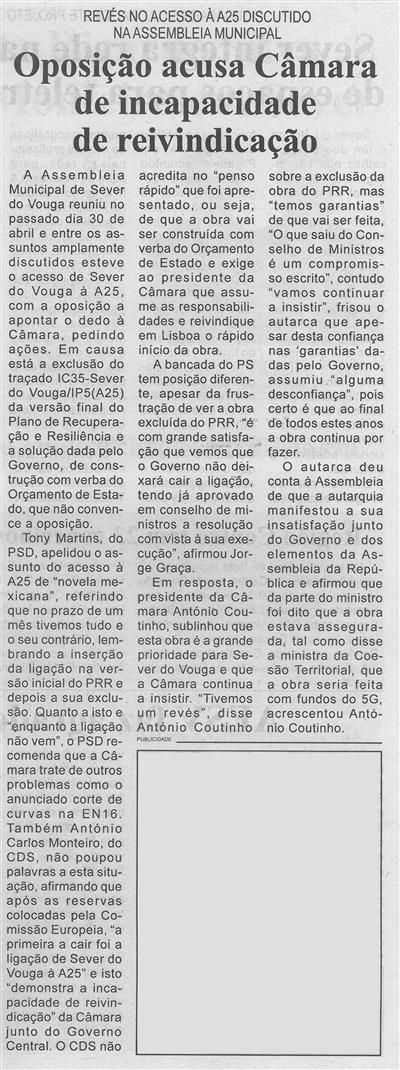 BV-1.ªmaio'21-p.5-Revés no acesso à A25 discutido na Assembleia Municipal : oposição acusa Câmara de incapacidade de reivindicação.jpg