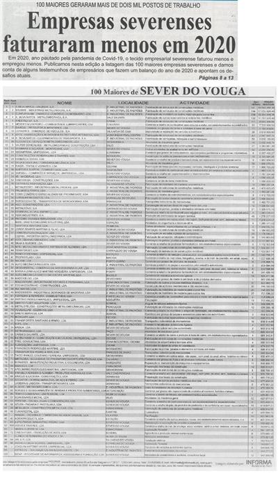 Empresas severenses faturaram menos em 2020 : 100 maiores geraram mais de dois mil postos de trabalho ; Cem maiores empresas de Sever do Vouga no ano económico de 2020