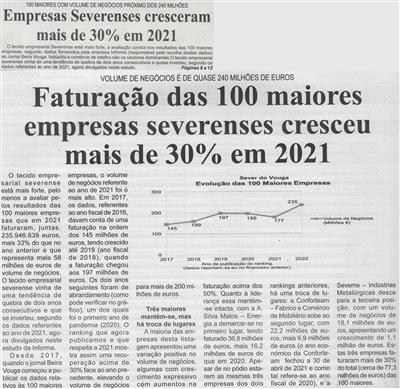 Faturação das 100 maiores empresas severenses cresceu mais de 30% em 2021 : volume de negócios é de quase 240 milhões de euros / Beira Vouga