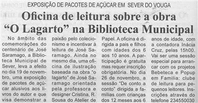 Oficina de leitura sobre a obra O Lagarto na Biblioteca Municipal : exposição de pacotes de açúcar em Sever do Vouga / Beira vouga