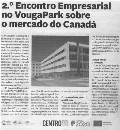 1.º Encontro Empresarial do projeto INOV@IERA ; Importação e exportação com a diáspora dos EUA ; Acesso aos mercados dos EUA : oportunidades e desafios ; O empreendedorismo qualificado ; Projeto INOV@IERA - Inovação no apoio ao empreendedorismo na Região de Aveiro ; Centro 2020 ; Portugal 2020 ; Fundo Social Europeu ; Chegar a todo o território
