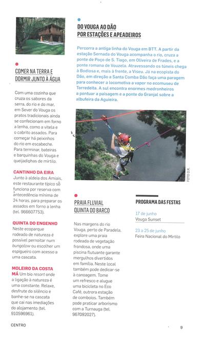 Guia de verão ; Descubra um país que poucos conhecem ; Boa cama boa mesa ; Aventuras na Serra ; Minas do Braçal ; Pedra da Moura ou Anta da Cerqueira ; Quedas de água e mergulhos selvagens ; Bosques, minas e socalcos de mirtilos ; Bungee Jump para a água ; Comer na Terra e dormir junto à água ; Do Vouga ao Dão por estações e apeadeiros ; Praia Fluvial Quinta do Barco