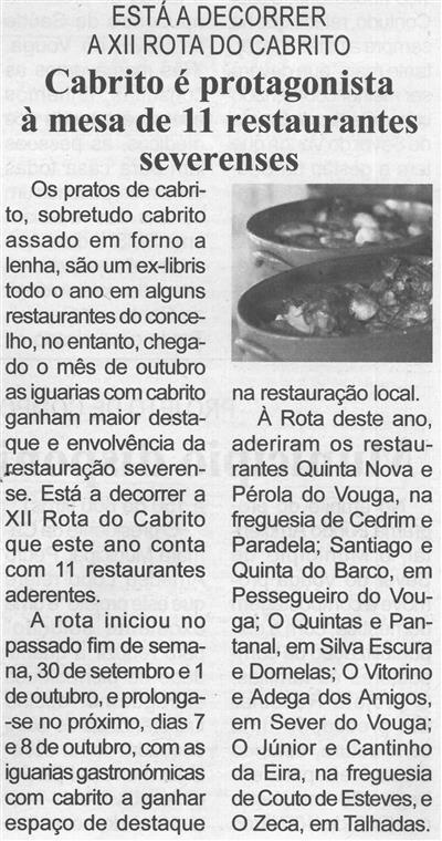 Cabrito é protagonista à mesa de 11 restaurantes severenses : está a decorrer a XII Rota do Cabrito / Beira Vouga