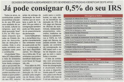 Já pode consignar 0,5% do seu IRS : dezasseis entidades albergarienses e oito severenses autorizadas a beneficiar deste apoio / Beira Vouga