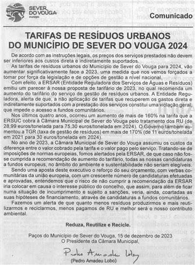 Tarifas de resíduos urbanos do Município de Sever do Vouga 2024 : comunicado / Pedro Amadeu Lobo