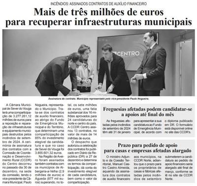 Mais de três milhões de euros para recuperar infraestruturas municipais : incêndios : assinados contratos de auxílio financeiro / Beira Vouga