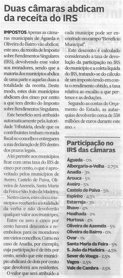 Duas câmaras abdicam da receita do IRS / Diário de Aveiro