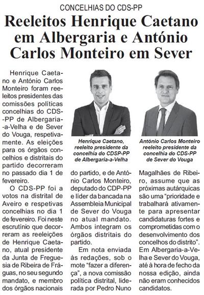 Reeleitos Henrique Caetano em Albergaria e António Carlos Monteiro em Sever : concelhias do CDS-PP / Beira Vouga
